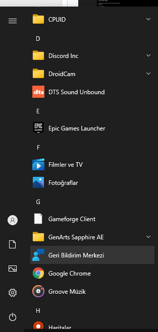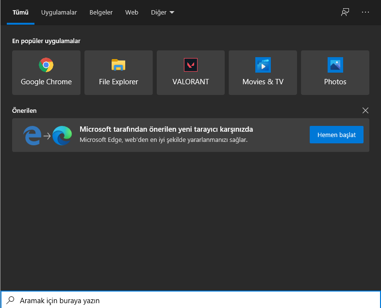 Son olarak: Başlat ekranında Türkçe olarak çıkan şey Arama ekranında İngilizce.