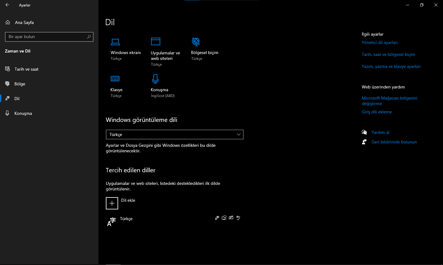 Windows 10'umu Türkçe'den ingilizceye çevirdim bir ay boyunca böyle devam ettim ama dün geri Türkçeye çevirmeye çalıştığımda yarı İngilizce yarı Türkçe oldu.