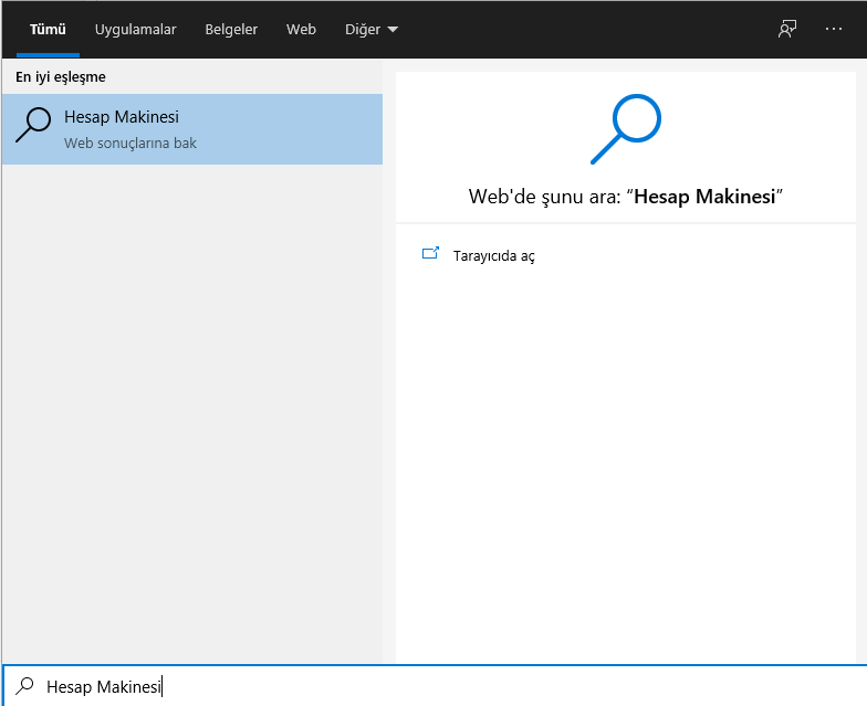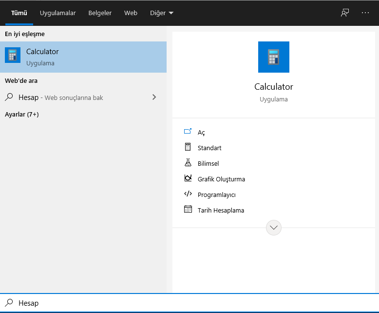 İşin garip kısmıysa Türkçe "Hesap" yazdığımda çıkıyor ama "Hesap Makinesi" yazınca çıkmıyor.