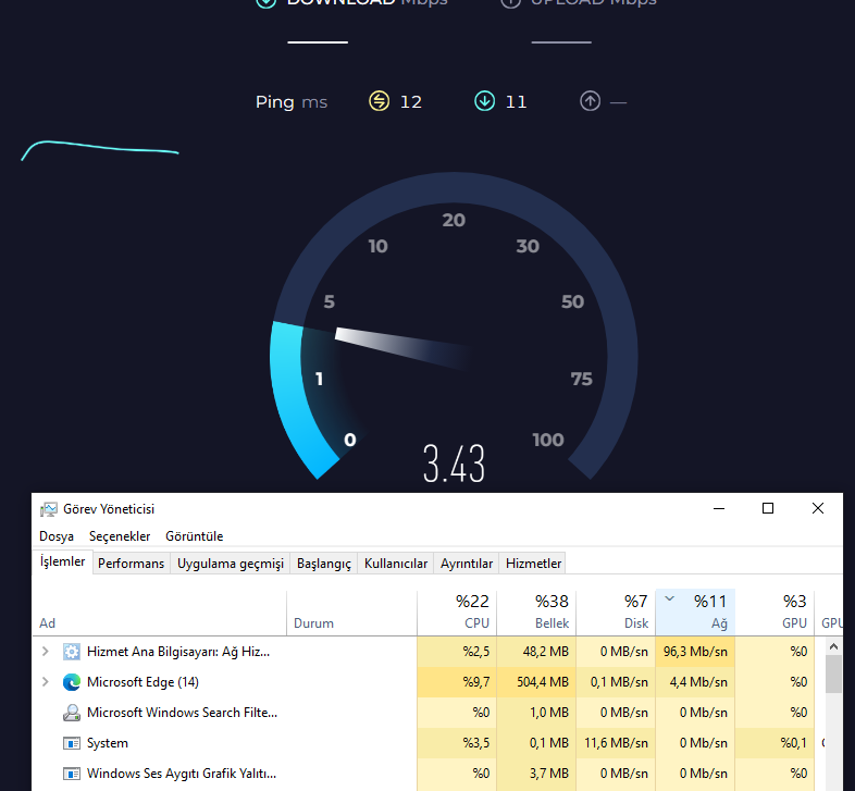 TurkNet 100 Mbps kullanıcısıyım. Bugün bilgisayarda indirme hızı 10 Mbps'ye düştü. Telefonlarda ve Ethernet kablosunda sıkıntı yok upload da sıkıntı yok. Hatta Görev Yöneticisi'nden baktığımda hızda da bir sıkıntı gözükmüyor. Ama internet bu halde. Nasıl çözebilirim? Acaba son güncellemelerle mi alakası var?