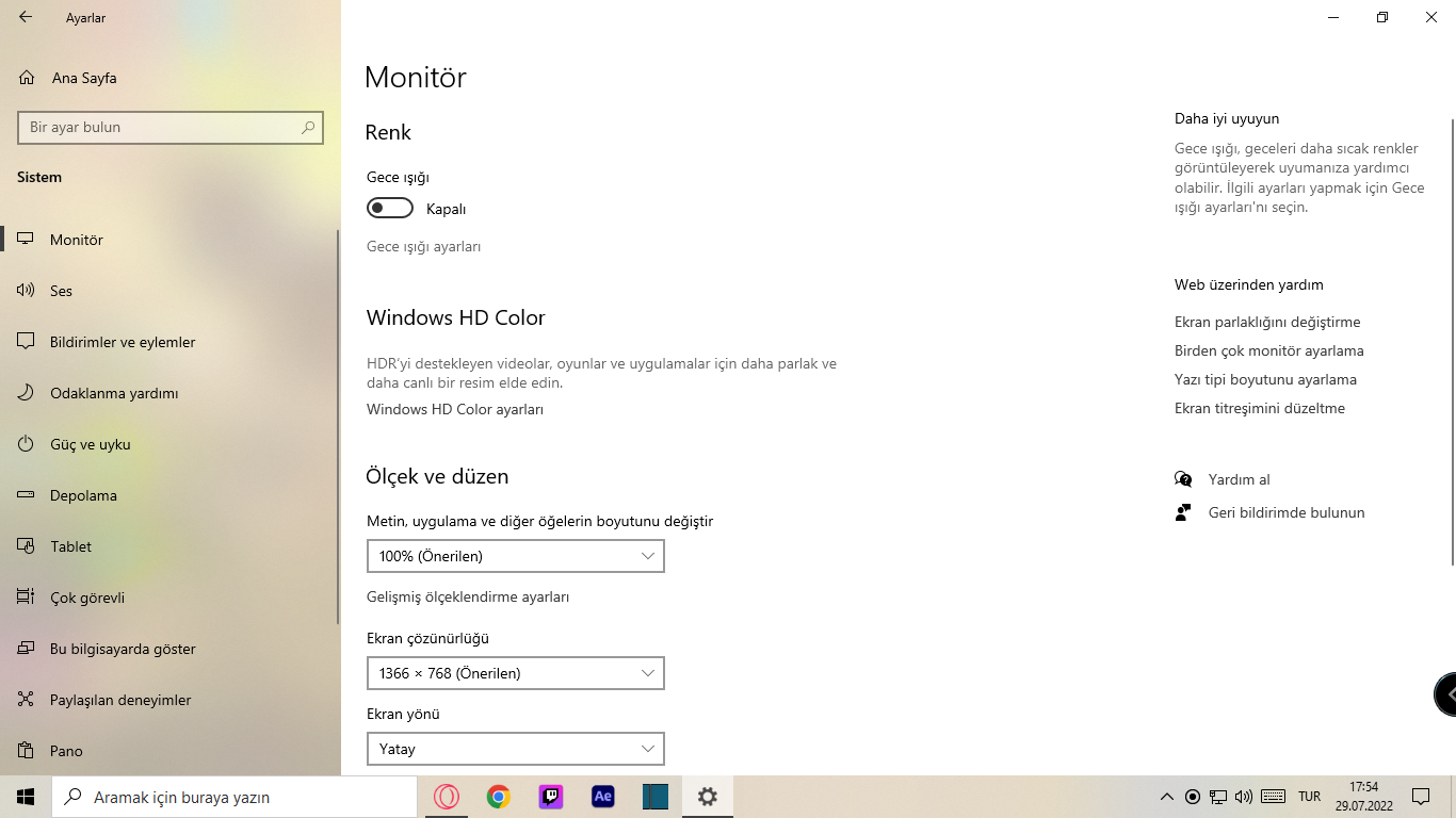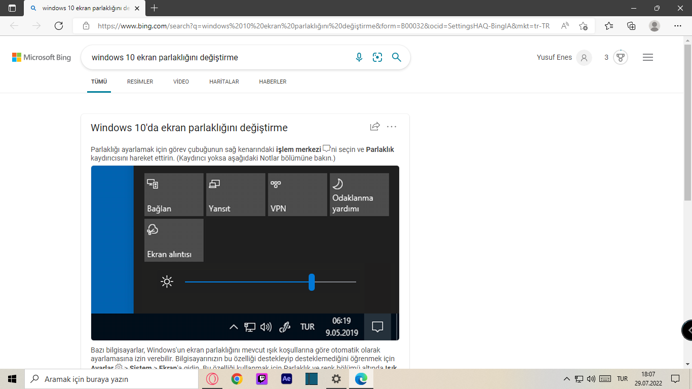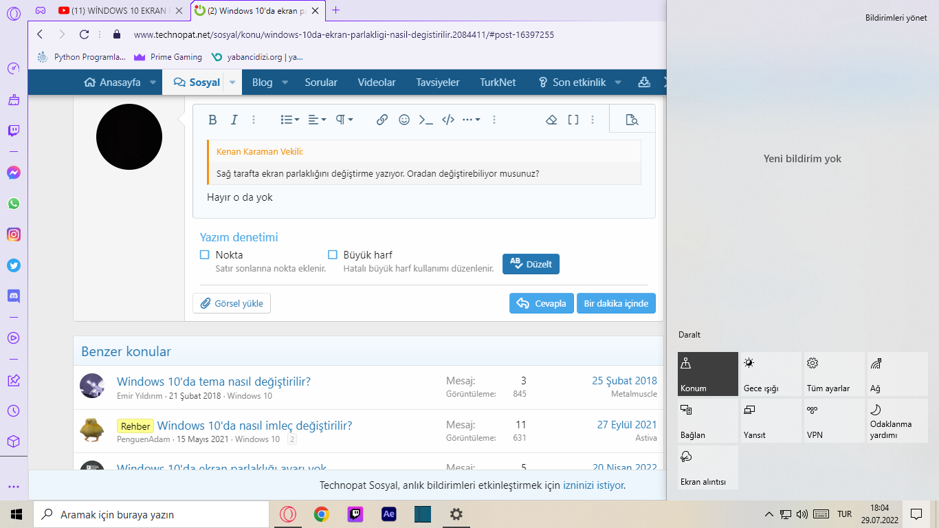 Sağ tarafta ekran parlaklığını değiştirme yazıyor. Oradan değiştirebiliyor musunuz?
