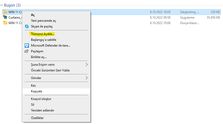2. Ardından "Tümünü Ayıkla" diyerek türünü klasör yapıyoruz.