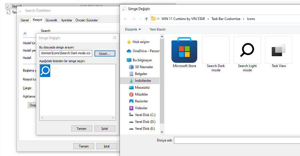 5. Sonra Search ve Task Wiew klasörünün simgesini değiştiriyoruz ve görev çubuğuna ekliyoruz. "Icons" kısmında simgeleri bulabilirsiniz.