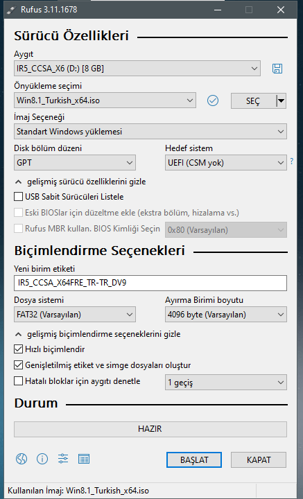 Windows 10 kullanıcısıyım ve Windows 8.1'e geçmek istiyorum HDD ve 4 GB RAM'im olduğu için. Bunu nasıl yapacağım? Rufus ile bir flash bellek hazırladım;