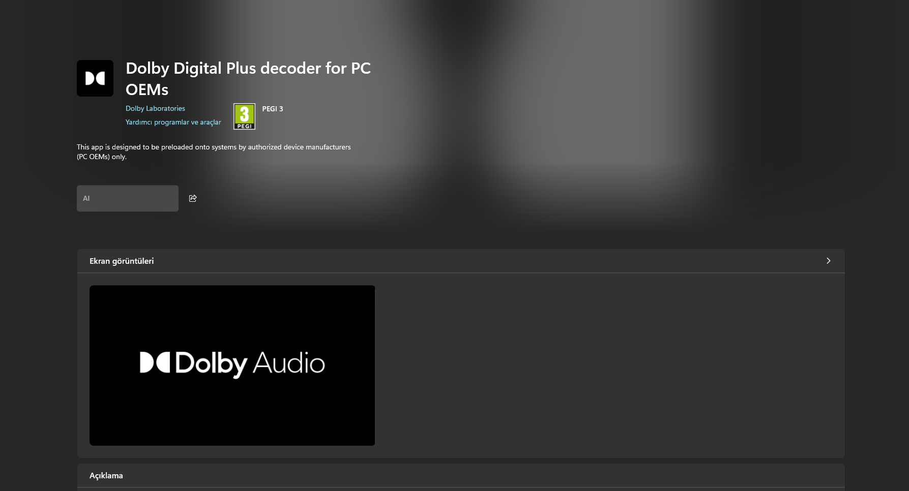 Apps kısmında çıkıyor ola ki otomatik yüklenmezse buradan Realtek Audio Console ve DTS Custom'ı yüklüyorduk manuel olarak Microsoft Store'dan. Bunu da bugün eklenmiş Dolby AC-3 codec.