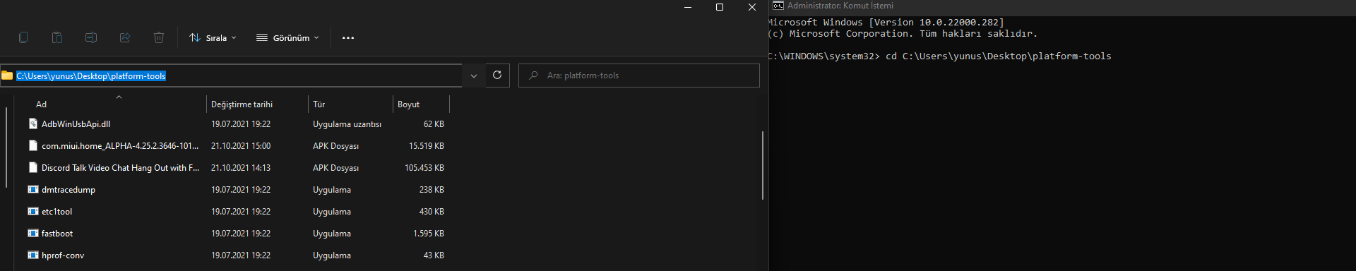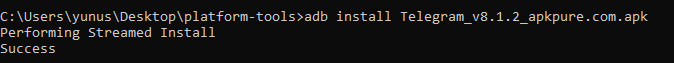 5. Adım: Şimdi ise herhangi bir yerden indirdiğimiz APK dosyasını platform-tools klasörünün içine atıp şu komut ile kuruyoruz.