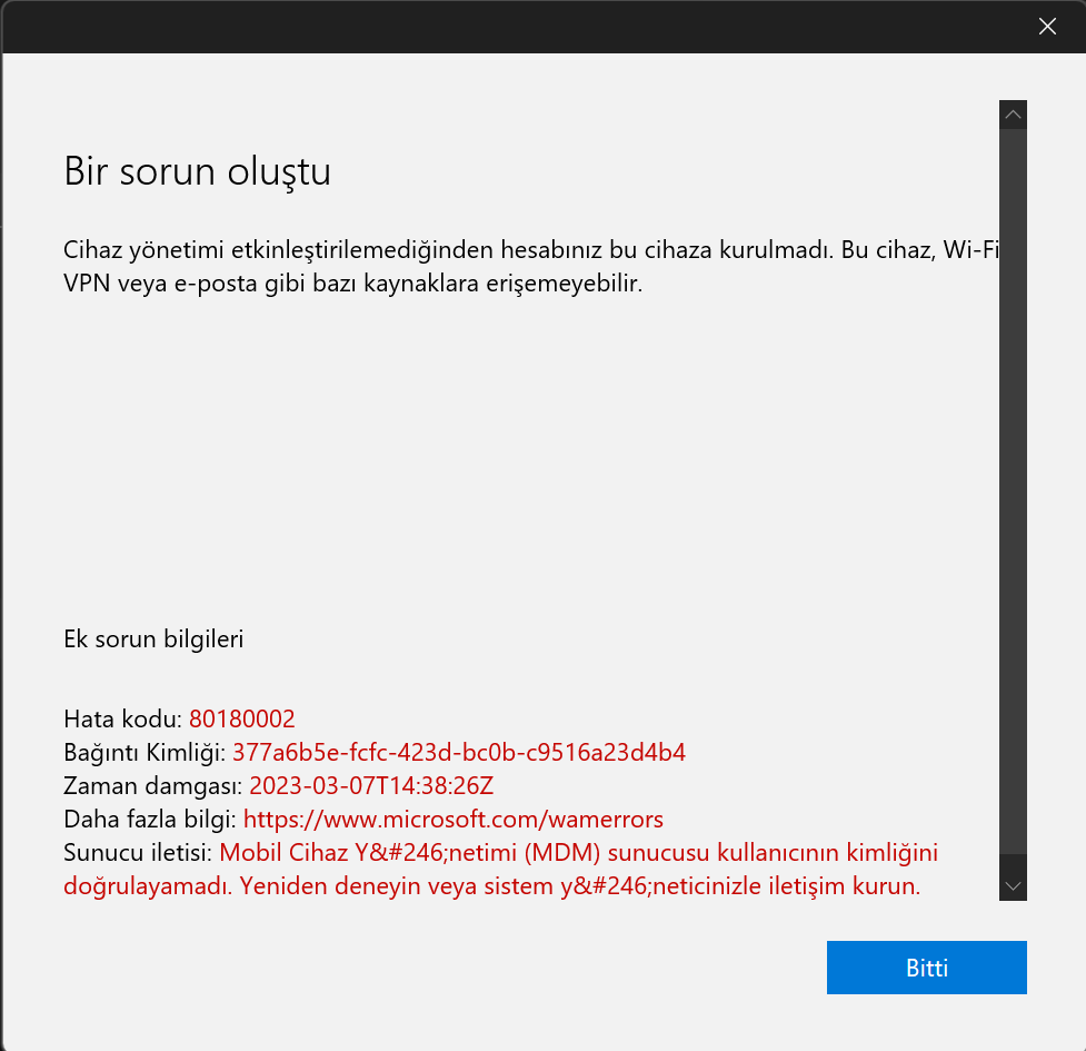 Ayrıca hesap yerel hesap değil, Microsoft hesabı olduğu için böyle olduğunu söyleyenler vardı ama yerel hesap yaptıktan sonra da aynı sorun devam etti. Microsoft'a geri geçtim ben de. Ancak şu an bir sorunum daha var. Okul hesabımı geri ekleyemiyorum Windows'a. Böyle hata veriyor: