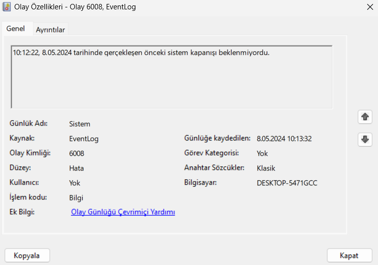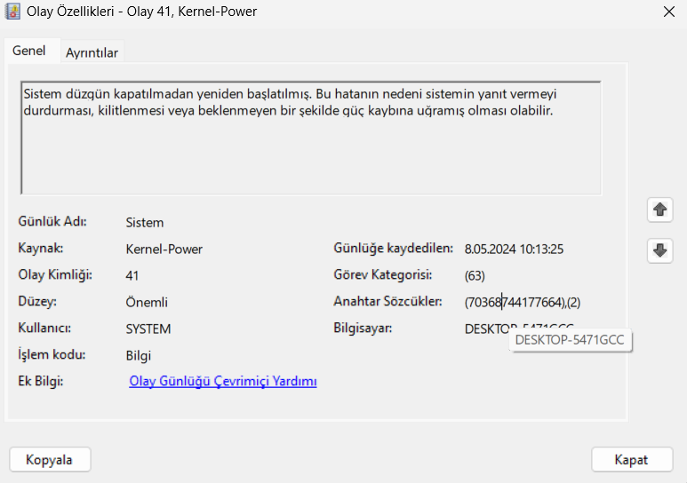 Windows günlüklerine bakar mısınız bir de bilgisayarın açılış zamanında hata kodu var mı ?