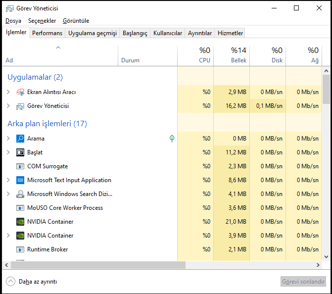 Benim boşta böyle hocam. Hiç bir uygulama açık değil.