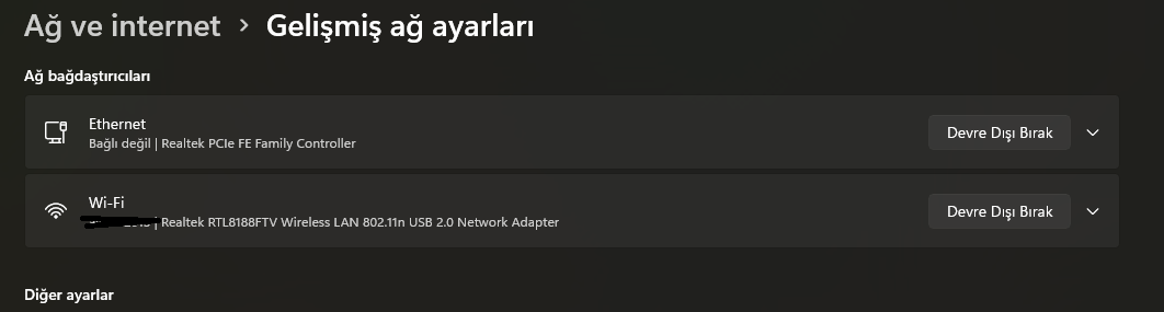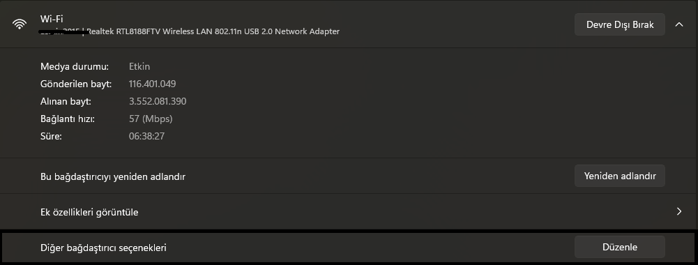 Bastıktan sonra açılan yerden "Diğer bağdaştırıcı seçenekleri" yanında bulunan "Düzenle" butonuna basınız.