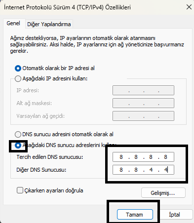 Son olarak ise açılan sekmeden "Aşağıdaki DNS sunucu adreslerini kullan" seçeneğini aktif edip ardından, tercih edilen DNS sunucusuna "8.8.8.8", diğer DNS sunucusuna ise "8.8.4.4" yapıp tamam basıyoruz.