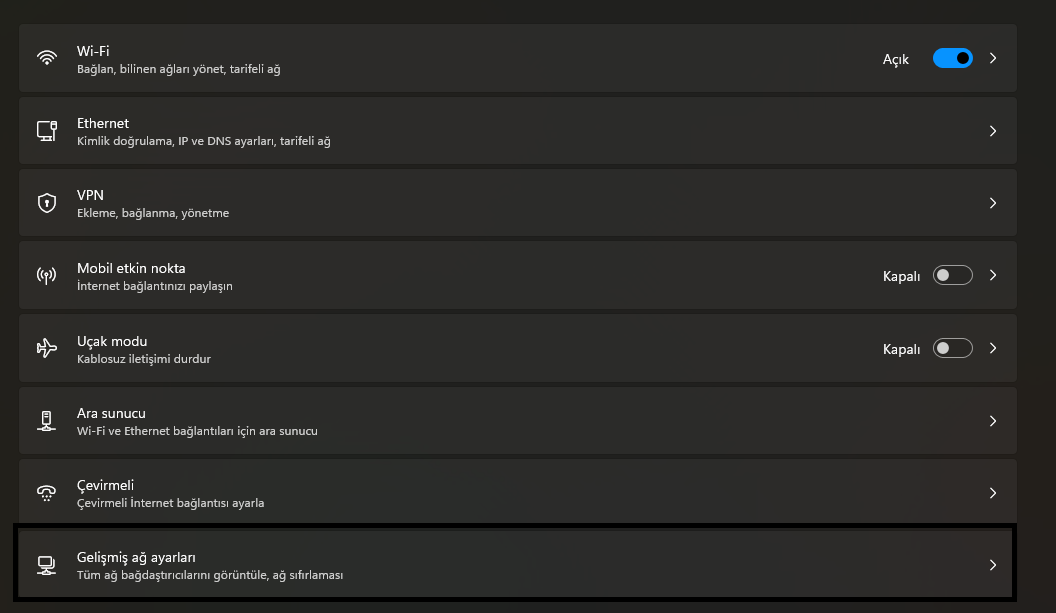 Ardından ise açılan sekmeden "Gelişmiş ağ ayarları" sekmesine basıyoruz.