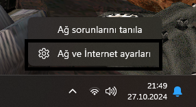 Sağ alttaki Wi-Fi simgesine sağ tıklıyoruz ve "Ağ ve İnternet ayarları" sekmesine giriyoruz.