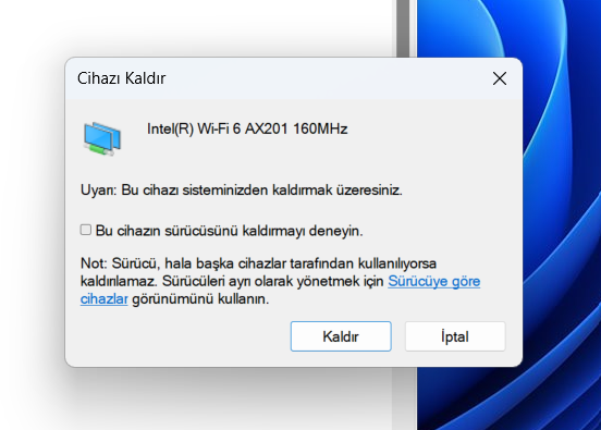 Sanmıyorum sen Aygıt Yöneticisi'nden sağ tık yap cihazı kaldır de cihazın sürücü yazılımını sil işaretli olsun uygula de indirdiğin Intel Wi-Fi driverını kurup laptopu yeniden başlat.