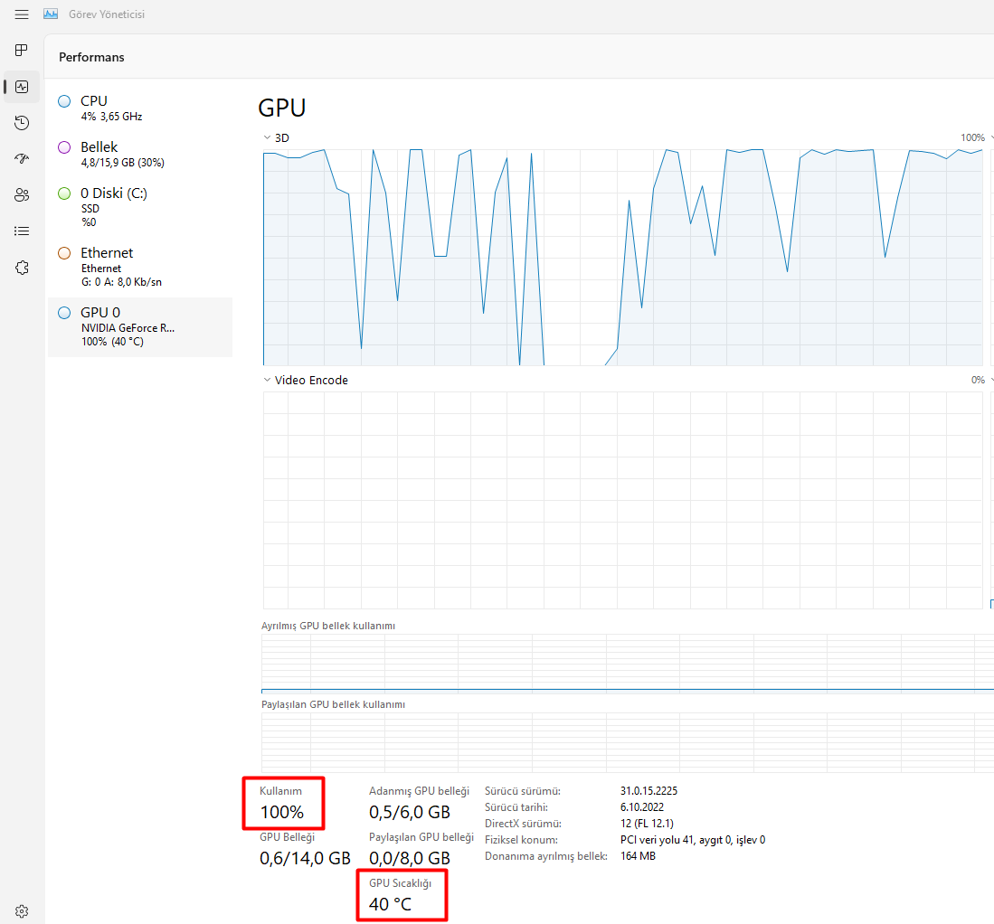 Windows 11 görev yöneticisinde GPU %100 hatası