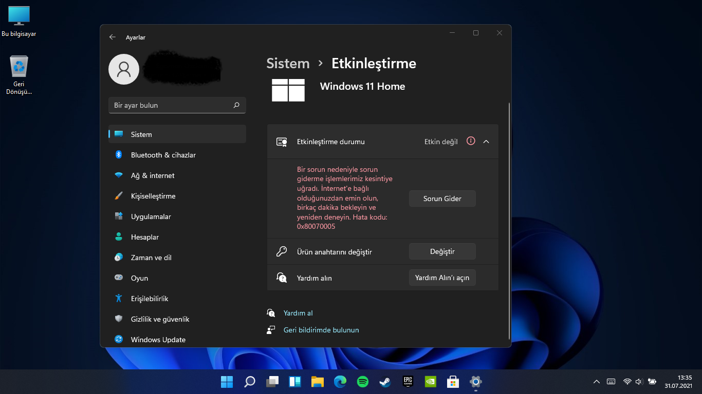 Dün ilk kurduğumda etkin gözüküyordu ama şimdi etkin gözükmüyor. Normalde Windows 10 Home Retail lisansım vardı. Acaba bilgisayarım Windows 11 ile uyumlu değil diye mi Windows etkinliği kaldırdı? Yükseltmeyi forumda paylaşılan modlu ISO ile yaptım. Aslında oldukça memnunum. Son derece hızlı, stabil ve hatasız kullanıyorum.