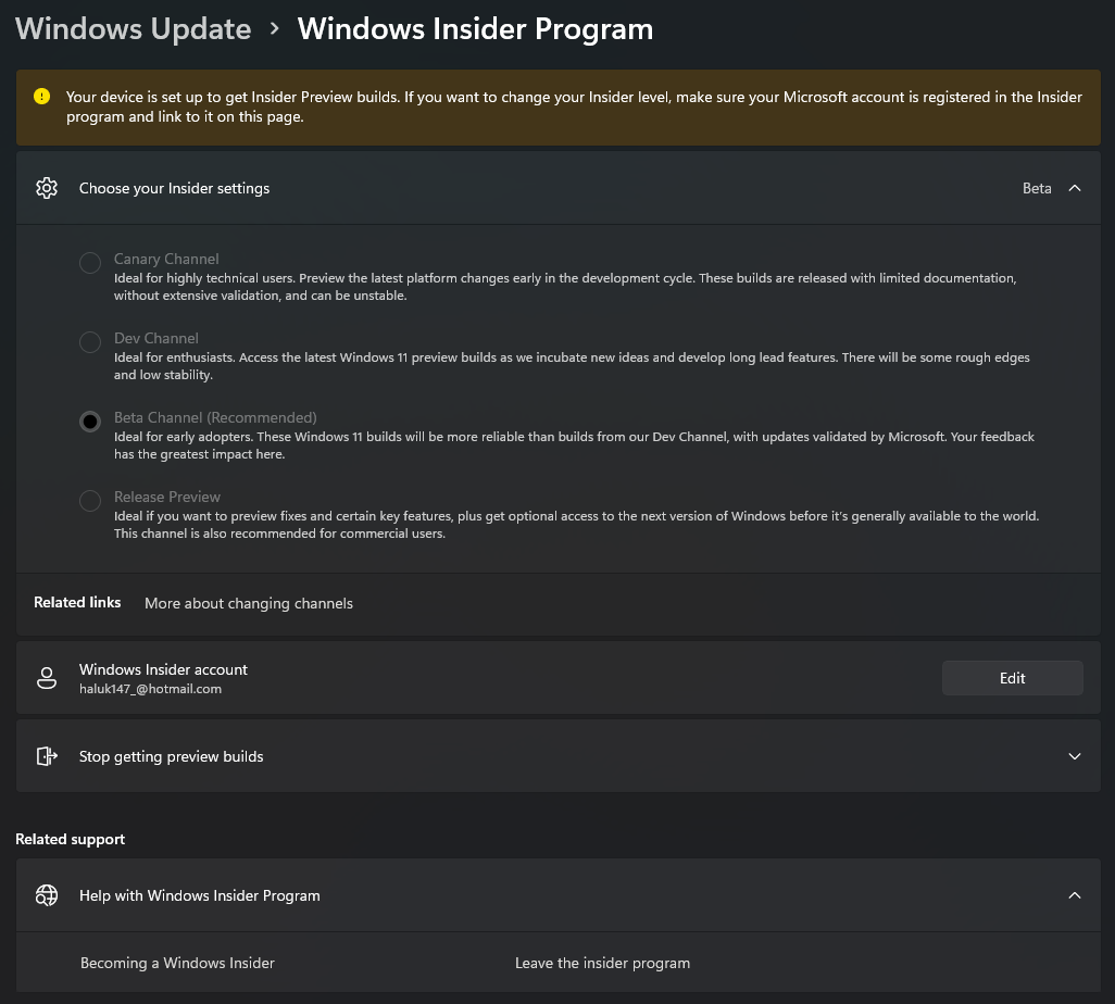 Insider'a katılıyorum fakat katılmadım olarak gözüküyor. Ek olarak canary Channel'a geçemiyorum. Benzer sorunu yaşayan var mı?