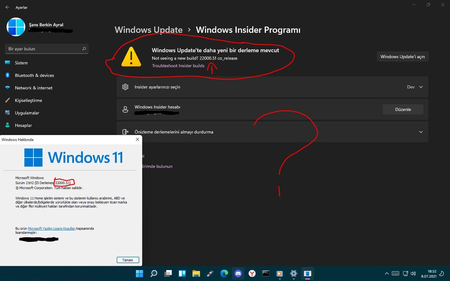 Arkadaşlar tam başlığa ne yazacağımı bilemedim olay şu Windows 11 sürümüm en son 22000.51 sürümü ancak Insider kısmına girdiğimde daha yeni bir derleme var diyor ama daha yeni bir derleme dediği bendekinin aynısı ve Update'e girdiğimde bir güncelleme yok. Durum bu: