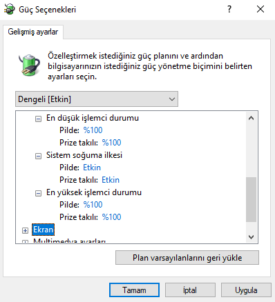 Denetim Masası >Sistem ayarları > Güç seçenekleri>Plan ayarlarını değiştir> Gelişmiş güç ayarlarını değiştir bölümüne girin ve Aşağıdaki resimdeki gibi ayarlayı uygulayın ve sisteminizi yeniden başlatın.