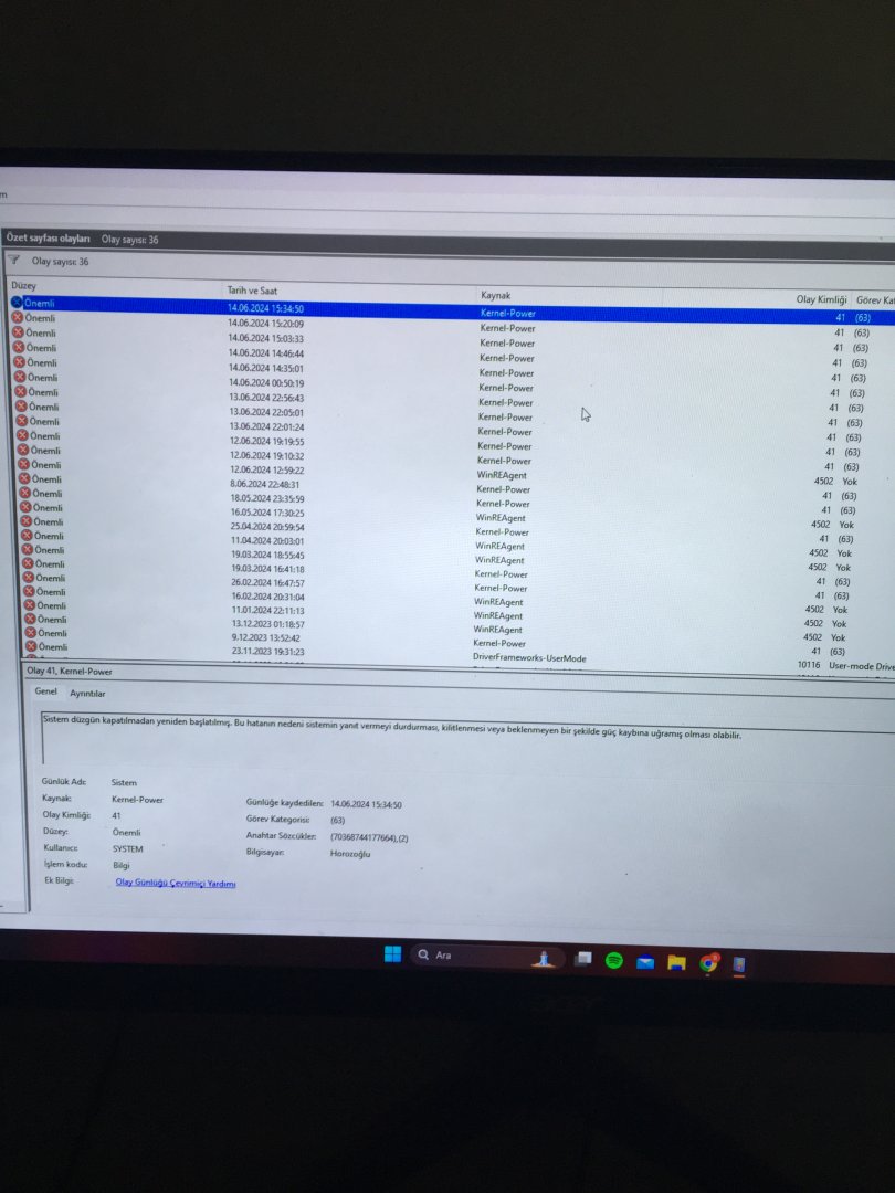 Bilgisayarım 2 gündür garip bir şekilde bir anda donuyor. Duvar kâğıdı bembeyaz oluyor ve “windows yanıt vermiyor” hatasını alıyorum. Olay görüntüleyicisine baktığımda Kernel Power hatasını bu 2 günde 12 kez aldığımı gördüm. Daha öncelerden de nadiren görmüşüm bu hatayı. Görsellerde bıraktım. Windows donduğunda imlecim oynuyor fakat hiçbir işlem görmüyor. Bilgisayara reset attığımda bir sorun yokmuş gibi açılıyor fakat birkaç dakika sonra yine aynı hatayı alıyorum. Sorunu çözmek için bayağı bir çözüm yolu denedim. Bir bakıp analiz ederseniz sevinirim. Teşekkürler.