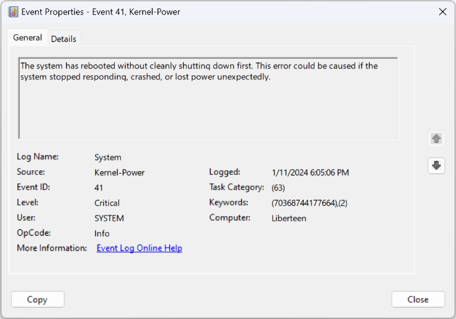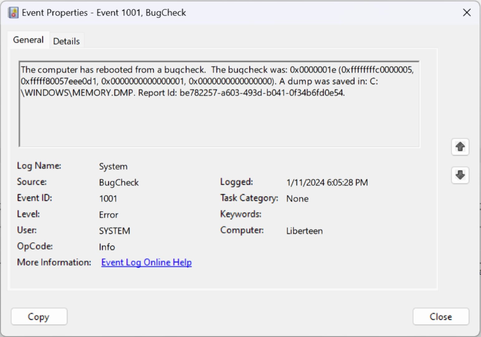 Windows Event Log'a göz attım, minidump dosyasını Google Drive hesabıma yükledim, paylaşıyorum.