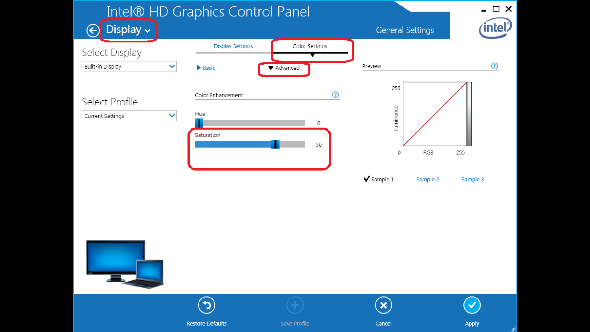 Renk doygunluğu ayarlarıyla oynamama rağmen hiçbir düzelme sağlamadı.