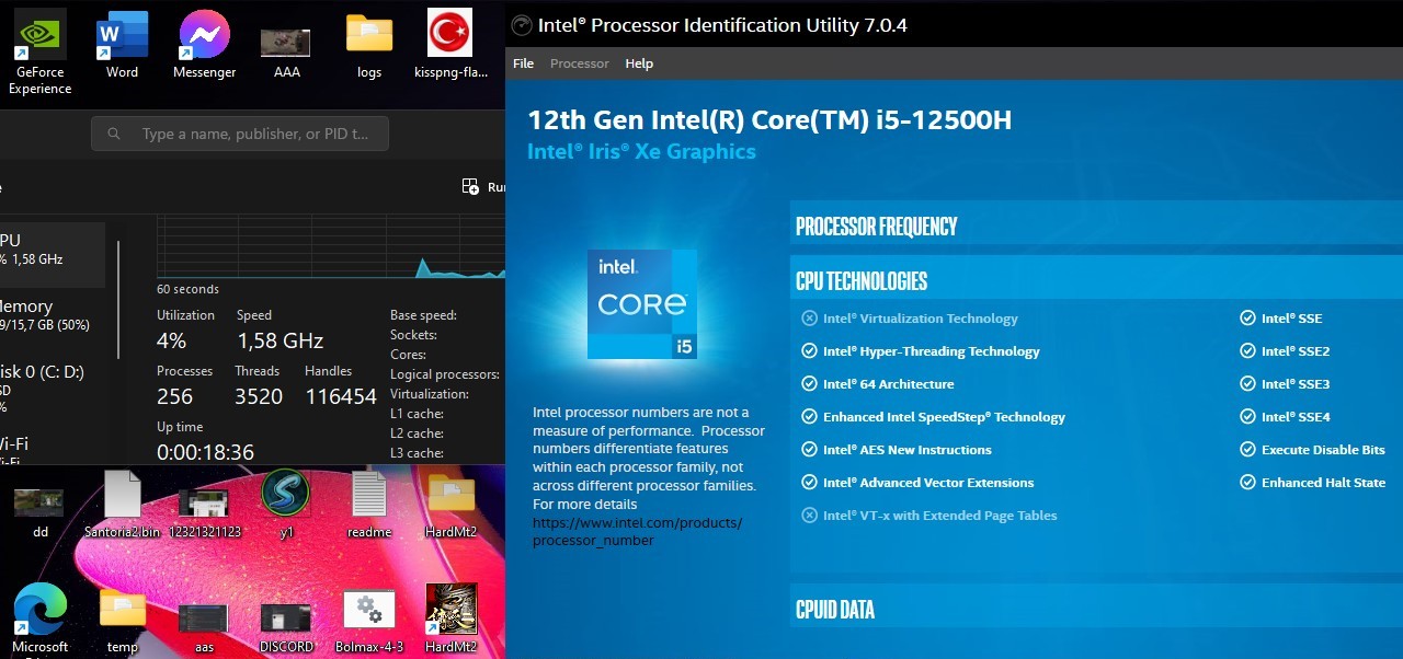 BIOS'tan kapatınca CPU penceresınde kapalı ama Intel uygulama açık.