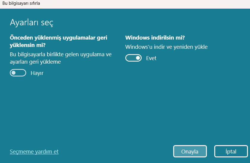 Aşağıda gördüğünüz gibi seçeneklerden birinde "Önceden yüklenmiş uygulamalar geri yüklensin mi?" yazıyor. Onun açıklamasında ise ayarların da silineceği yazıyor. Tam olarak anlayamadım, uygulamaların ayarları mı yoksa bilgisayarın ayarları mı? Benim için önemli çünkü uygulamaları silmek istemiyorum. Yalnızca ayarları değiştirmek için sıfırlıyorum.