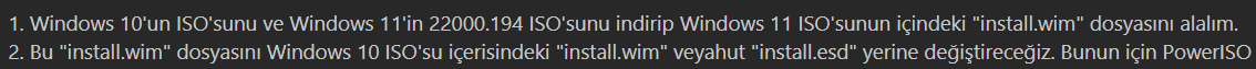 1. Windows 10'un ISO'sunu ve Windows 11'in 22000.194 ISO'sunu indirip Windows 11 ISO'sunun içindeki "install.wim" dosyasını alalım.