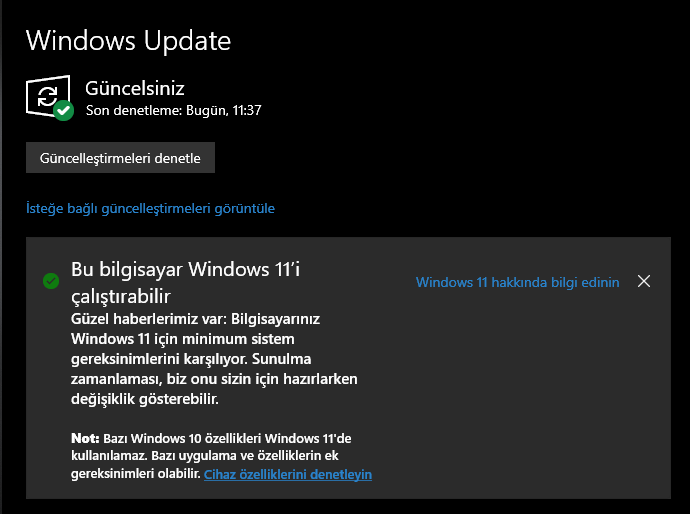 Windows Update kısmında böyle bir pencere iliştirilmiş. Bugün ilk defa gördüm, sanırım destekleyen bilgisayarlarda kontrol aracına gerek kalmadan otomatik olarak bilgilendirme yapılacak. Desteklenmeyen modellerde de olumsuz bir uyarı var mı bilmiyorum.