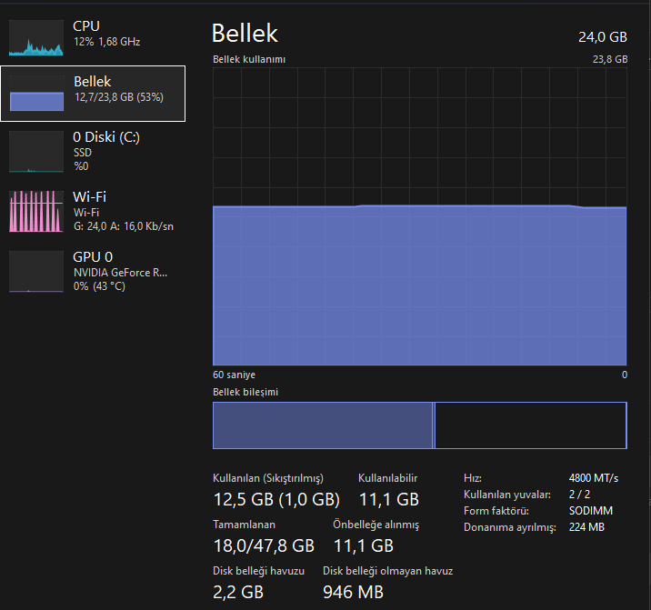 Dediğim gibi görev yöneticisinde en fazla zorlasan 7-8 GB kullanım çıkıyor ama toplamda 12 kullanılıyor gözüküyor. Sistem harici en fazla 3 GB zaten arka plan uygulamaları.
