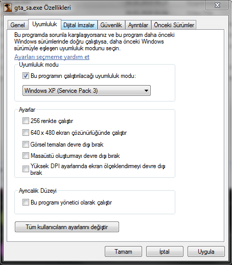 Yaptım olmuyorVeri yürütme engellemesi açıp deneyin, arama kısmına gelişmiş sistem ayarları yazın ve ilk çıkanı açın ardından performans kısmından ayarlara girin veri yürütme engellemesi kısmı var. Oradan en alttakini seçin ve aşağıdaki ekle tuşuna basarak GTA San Andreas'in dosya konumundan gta_sa.exe'yi seçin uygula deyin ve PC'nizi yeniden başlatın.