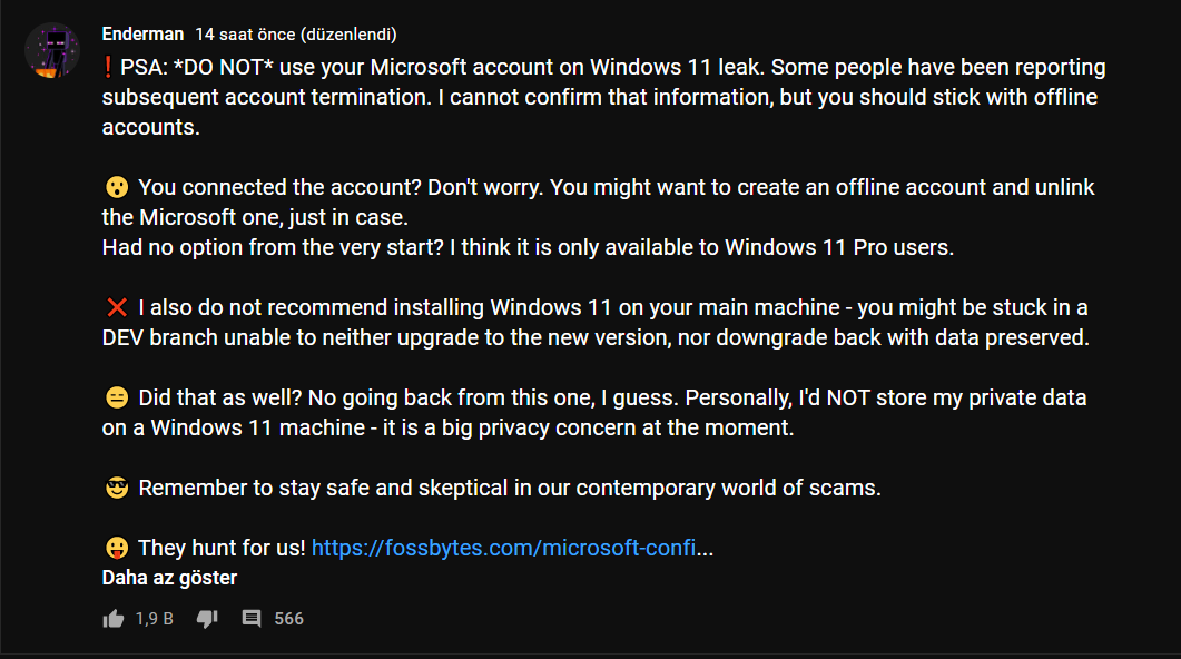 Microsoft, Windows 11 sızdırıldığı için hesaplarını bağlayan çoğu kişinin hesaplarını bloke ediyor. Bazı içerik üreticileri bunun uyarısını yapmaya başladı.