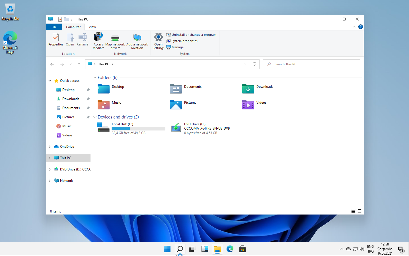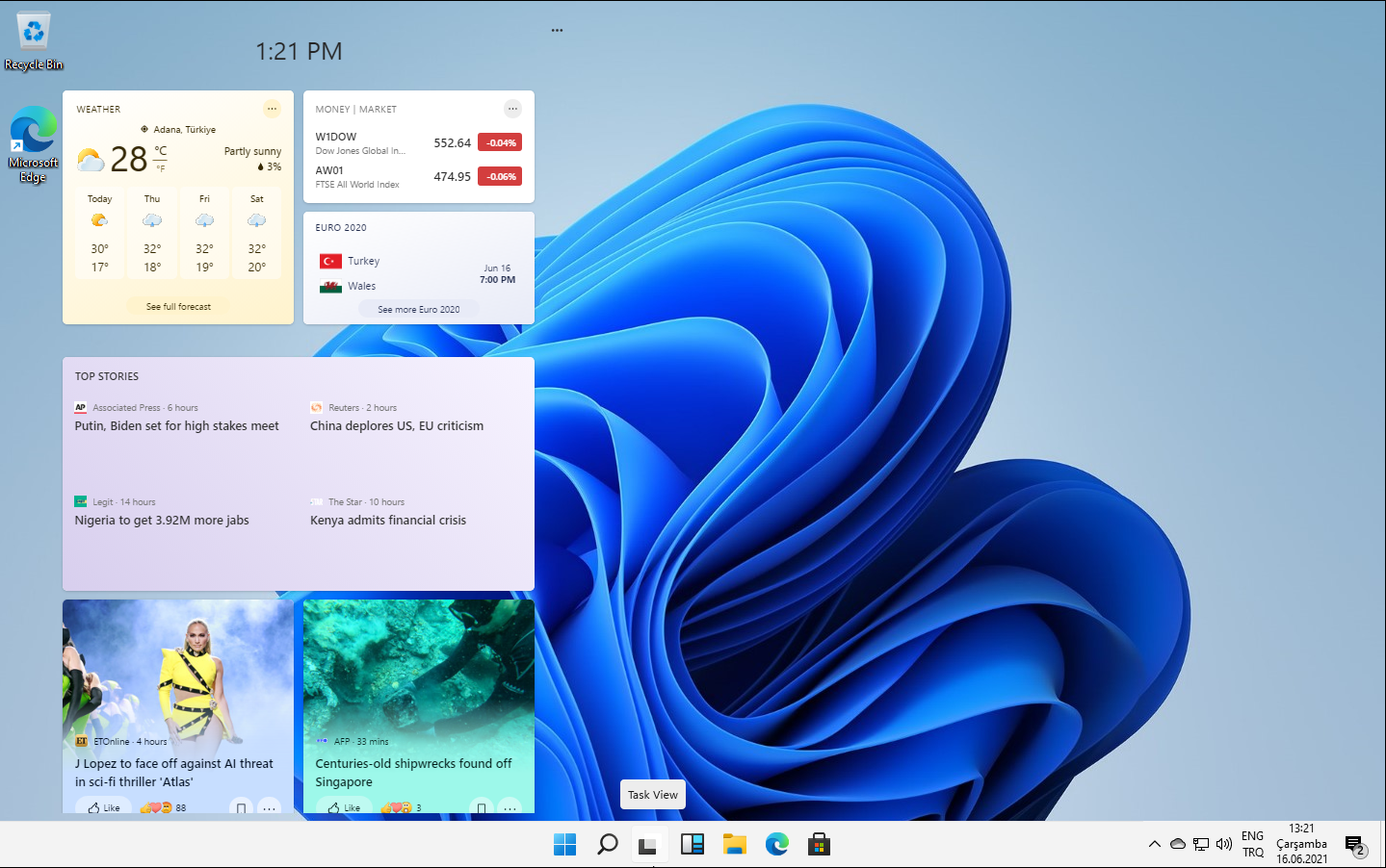 Standart kurulum işlemlerinin sonunda böyle bir masaüstü ile karşılaştım. Başlat menüsü ve diğer uygulamalar, Görev Çubuğu'nda ortaya hizalanmış. Başlat Menüsü simgesi değiştirilmiş. Biraz farklılık iyidir. Güzel duruyor. Sağ alttaki bildirim alanında bulunan simgeler önceki Windows sürümlerinden aşina olduğumuz gibi. Masaüstü ekran görseli de gayet hoş duruyor. Tabii ki de masaüstünde Geri Dönüşüm Kutusu olmazsa olmaz. 😄