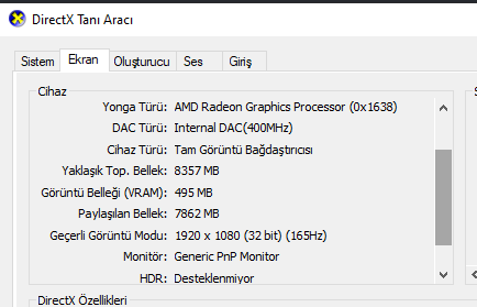 DxDiag ekran kısmında onboard kart geçer. Oluşturucu kısmında asıl ekran kartı görülür.