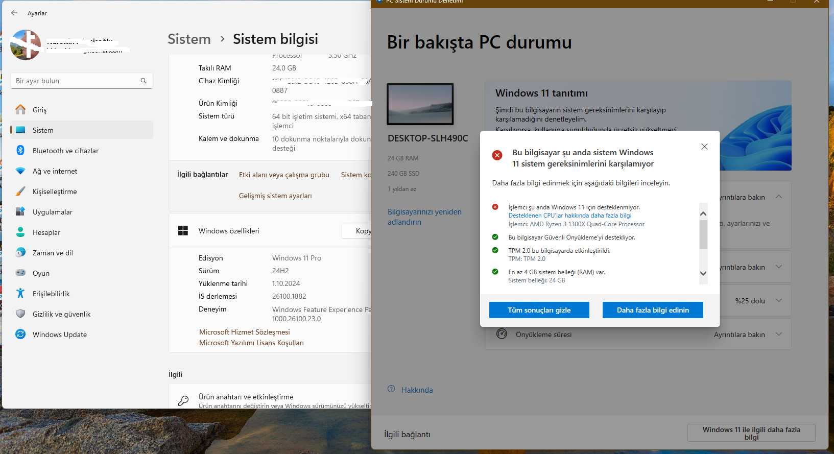 Benim işlemcim desteklemiyor diyor ama sistemimde mevcut 24H2 sistem kurulu.