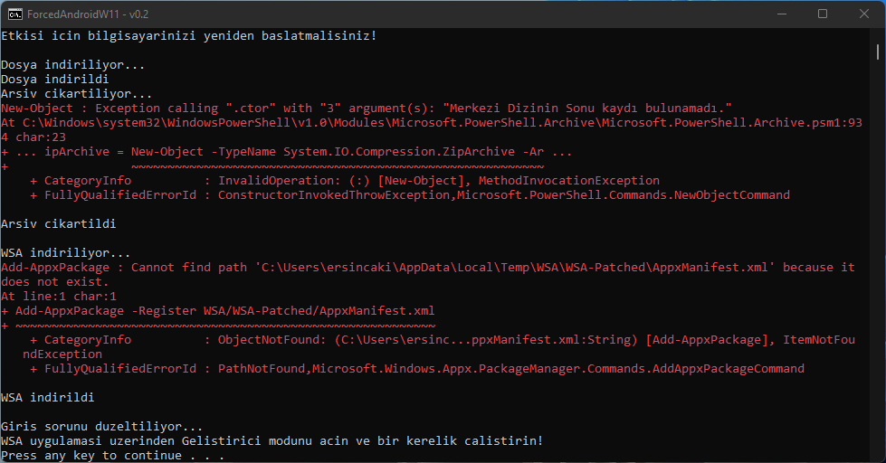 echo WSA uygulamasi uzerinden Gelistirici modunu acin ve bir kerelik calistirin!