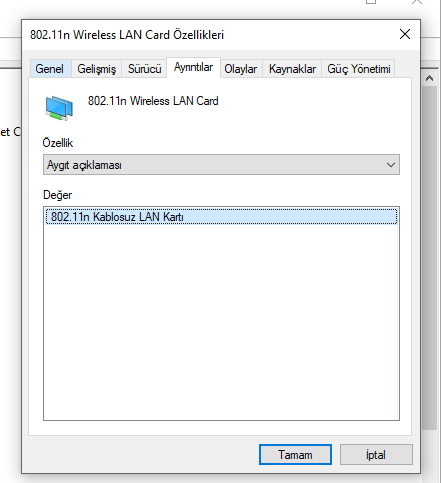 6. Bu ekrandan ağ bağdaştırıcıları bölümü olacak ordan wifinizi görürsünüz intel yada realtek dir saten. sonra ordan ona tıklayıp ayrıntıları gelin orda tıklayıp seçenekler çıkan bir ekran olacak. Ordan donanım kimliklerine basın ve ordaki kodu buraya atın yardımcı olalım.