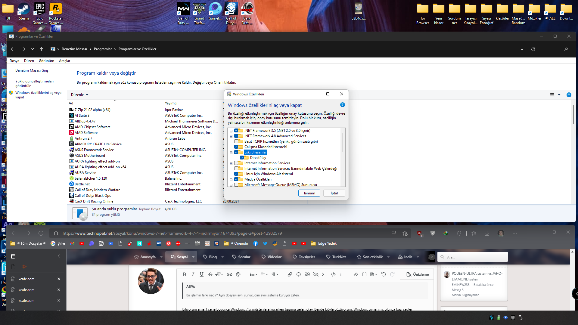 Program özeliklerini aç veya kapattan (Windows 8-10-11'de yok çünkü.) 3. parti yazılım veya .NET Installer yazması gerek. Onu tik koy ve tamam de...