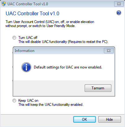 Bu linkten UAC kontroller uygulamasını indirin. Bu uygulama .NET paketine ihtiyac duyacagı için sana lazım bir dosya yükleme ekranı gelecek.