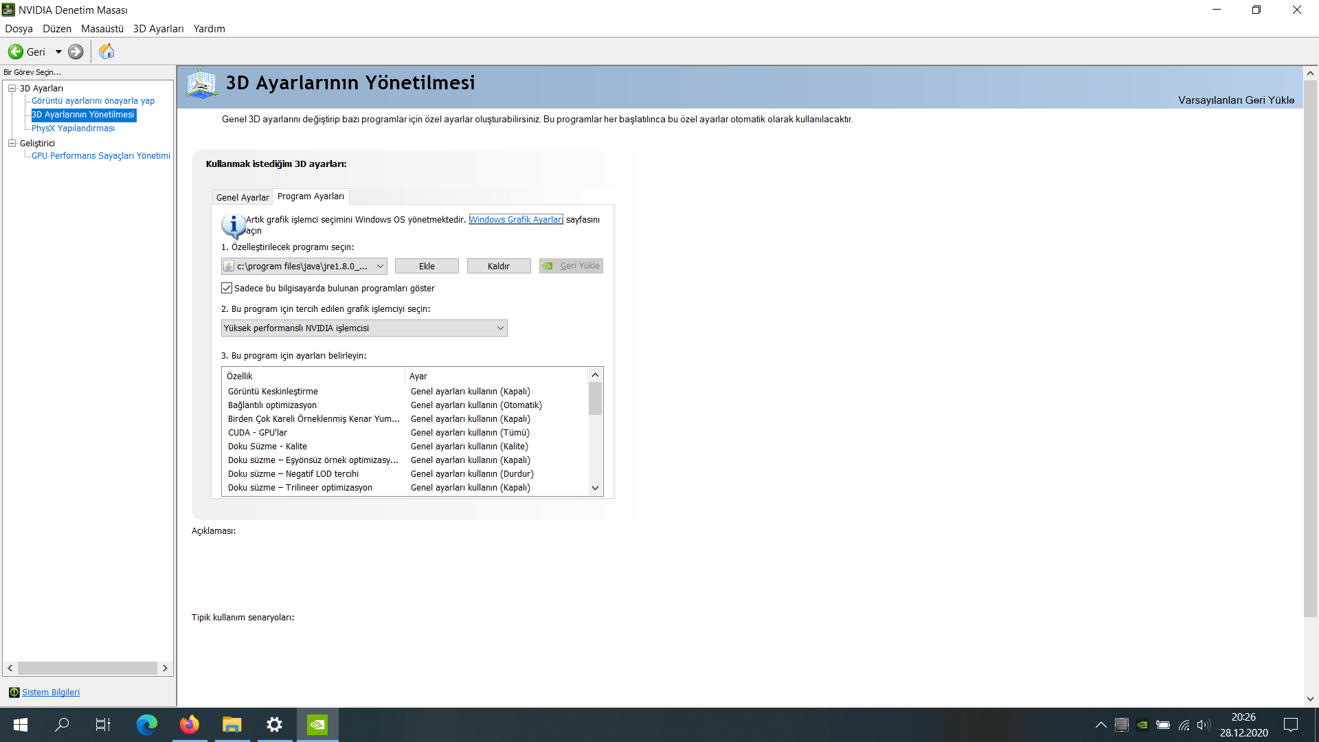 Onun da ayarı var.Bu işlem tarayıcı gibi programlarında NVIDIA ekran kartı ile çalışmasına yol açacaktır fakat oyunları bir de bu şekilde test etmek gerekiyor.