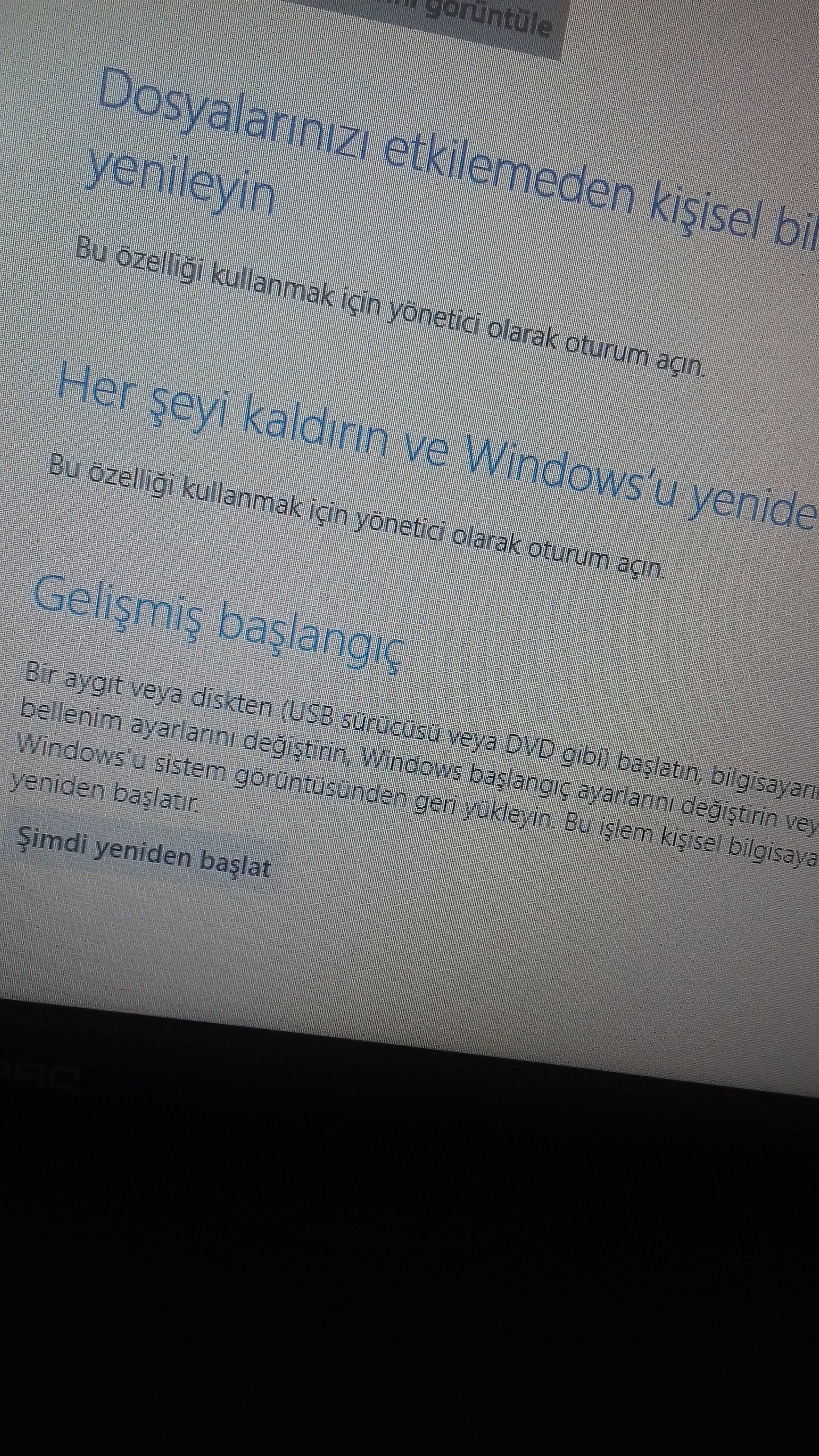 AZ önce shift tuşuna basarak yenilemeyi tekrar denedim ve o ekran çıktı. Kişisel bilgisayarınızı sıfırlayın diye bir bölüm var acaba oradan onu yapsam ne olur?