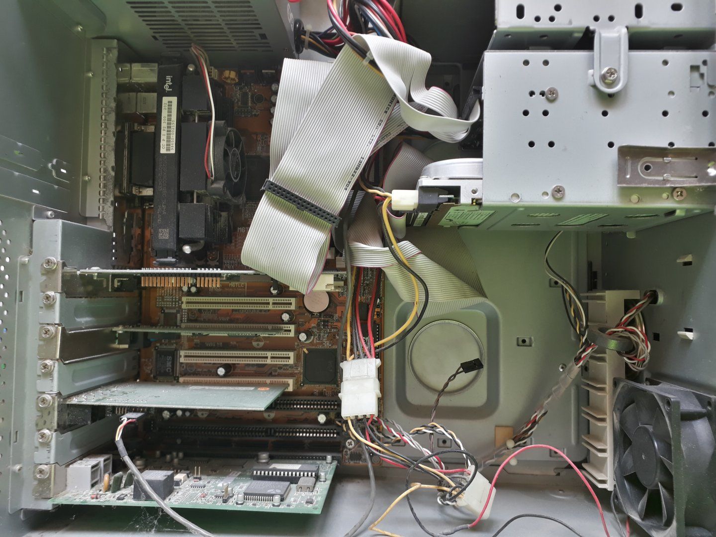 Bir şeyi bozmamak için içini çok fazla karıştırmak istemedim, ancak görebildiğim kadarıyla içerisinde Intel Pentium II işlemci (tam modeline ve hızına dikkat edemedim maalesef), ATI 3D Rage Pro Turbo AGP grafik kartı, 6GB depolama, DL10030A ethernet kartı, 250W PSU ve ESS Maestro PCI ses kartı bulunuyor. Ayrıca DVD ve floppy disk okuyucu da bulunuyor. Kablolama ve bağlantılar doğal olarak anakartın arkasında boşluk olmadığı için ön kısımdan yapılmış. Babama sorduğumda bu bilgisayarın değeri zamanında 5.000 dolarmış, o kadar eder mi hiçbir fikrim yok. 🙂