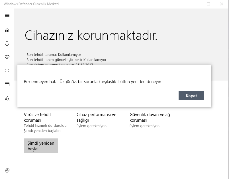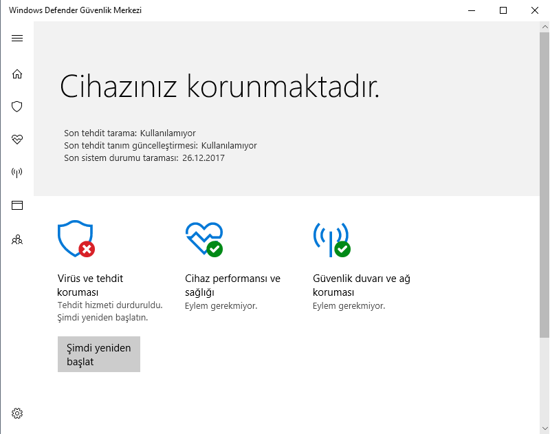 Problemin DWS den kaynaklandığını düşünüyorum bu programla kapattığınız Windows uygulamaları ile Defenderi de kapatmışsınız, tekrardan aynı programla değişiklikleri geri alma şansınız var.