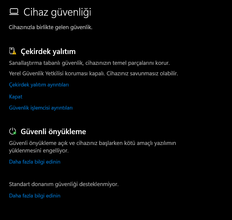 Arkadaşlar merhaba son 3 haftadır falan orijinal Windows 11 bilgisayarımda Windows Defender logosunun üstünde sarı ünlem olduğunu görüyorum ve defendera girdiğimde fark ettim ki 3 haftadır hızlı tarama bilgisi gelmiyor. Normalde her belirli zamanlarda hızlı tarama yapar bildirim olarak gelirdi gelmediğini fark ettim ve kendim yapmayı düşündüm ama Defender'a girdiğimde hızlı taramanın altında kullanılamıyor hatasıyla karşılaştım bununla beraber cihaz güvenliği kısmındada sarı ünlem olduğunu gördüm. İçerisine girdiğimde çekirdek yalıtım seçeneğinin kenarında sarı ünlem olduğunu fark ettim bunu nasıl düzeltebilirim başka konularda okuduğuma göre Windows 11 kullananların genelinde bu sorun varmış yabancı bloglardada söleniyormuş. Nasıl düzeltebileceğimi söylerseniz sevinirim.