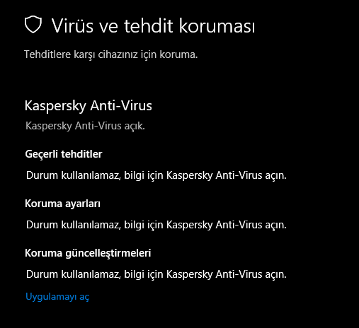 Bir kere Kaspersky yükledim geri silmiştim ama hala virüs koruması Kaspersky olarak gözüküyor.
