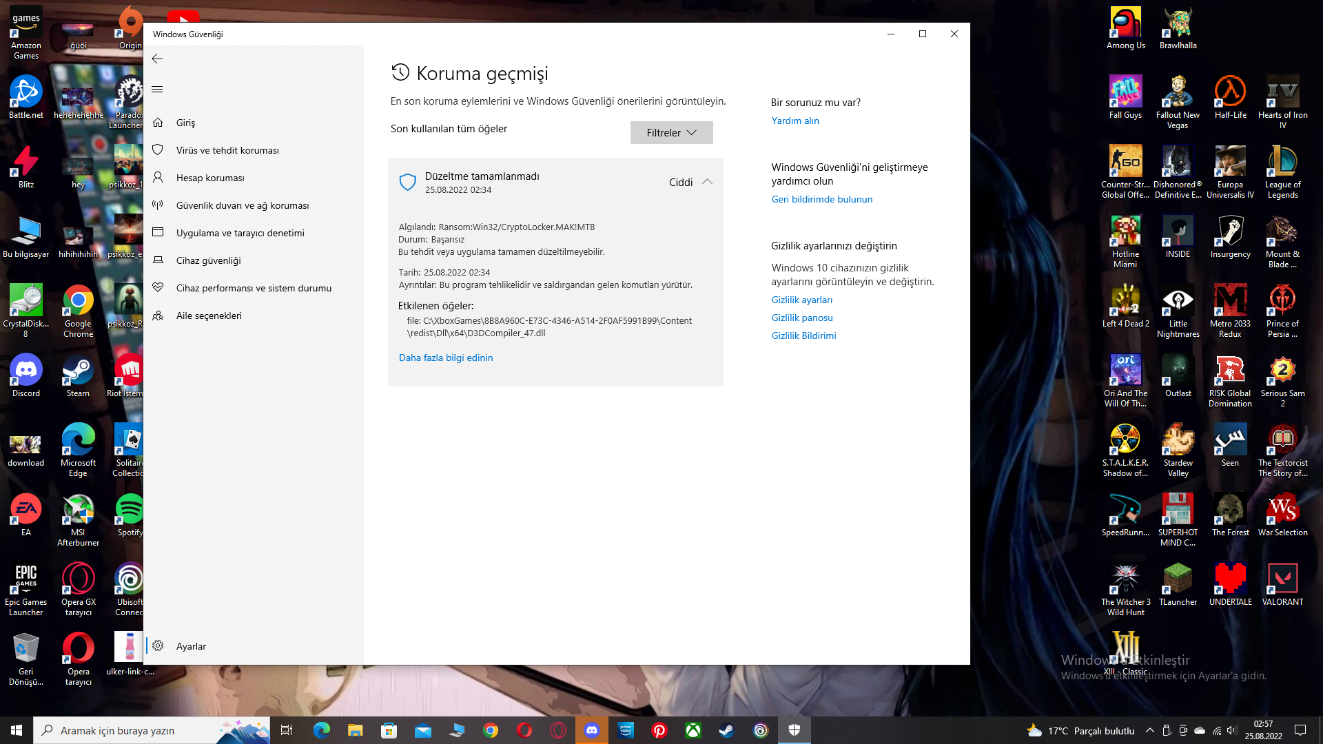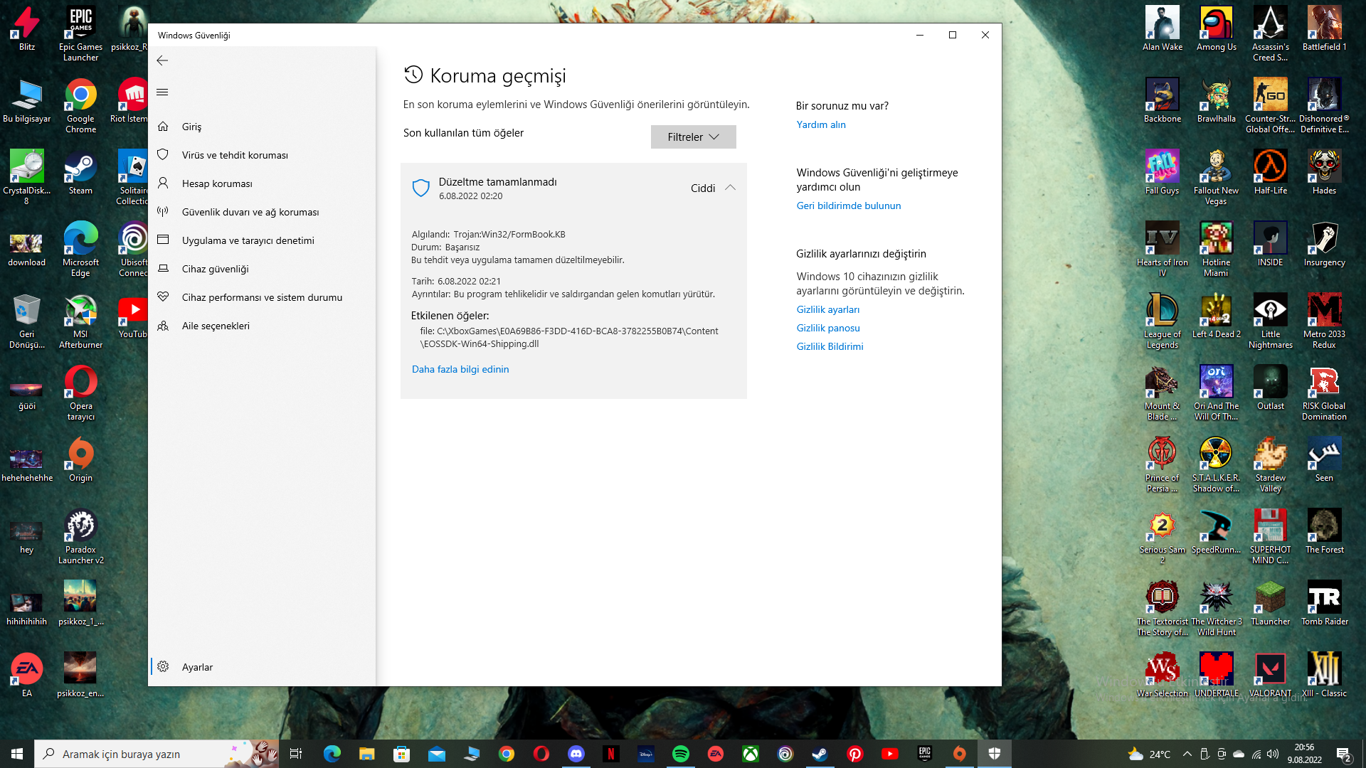 Windows Defender bundan yaklaşık 2 ay önce tarama yaptı ve ilk fotoğraftaki trojan virüsünü buldu, sonra ise tam tarama yaptım sorun bulamadı. İndirilen dosyaları falan her şeyi kontrol ettim etkilediği klasöre baktım ve bugün aynı şekilde ikinci fotoğraftaki bir fidye yazılımını buldu yine tam tarama yaptım indirilenlere baktım ve Xbox Games klasöründe bulunan o iki etkilenen dosyayı da sildim bu iki kere olunca anlayamadım. Durumu arkadaşlarıma sordum onların da fikri yoktu ben de buraya sormaya karar verdim şu an bilgisayarımda bir virüs var mıdır? Varsa nasıl bu virüsü silebilirim? Acaba şimdiden teşekkürler.