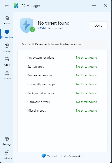 Yaptım sonuç böyle çıktı.Microsoft Store'dan Microsoft PC Manager uygulamasını indirin ve oradan taramayı dener misiniz?