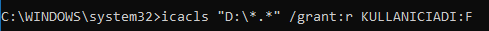 Eki Görüntüle 1334276Kod:icacls "D:\*.*" /grant:r KULLANICIADI:F