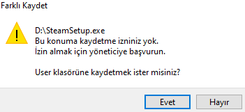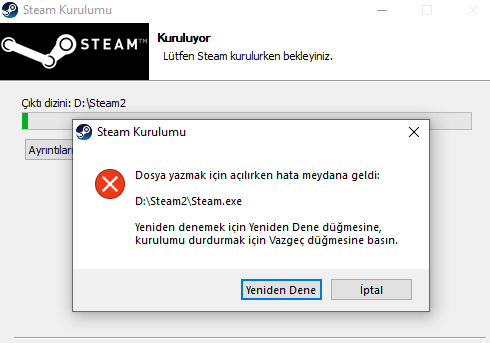 Başta olmadı sonra D'ye yeni klasör oluşturdum Steam diye onun içine kurdum ama yine olmadıHah şimdi oldu. Demek ki o D: diskinin çoğunluğunda, okuma ve yazma izni var ama silme ve tam denetim izni yok. Pekala şöyle yapacağız. Ne yazık ki ben İngilizce kullanıyorum.